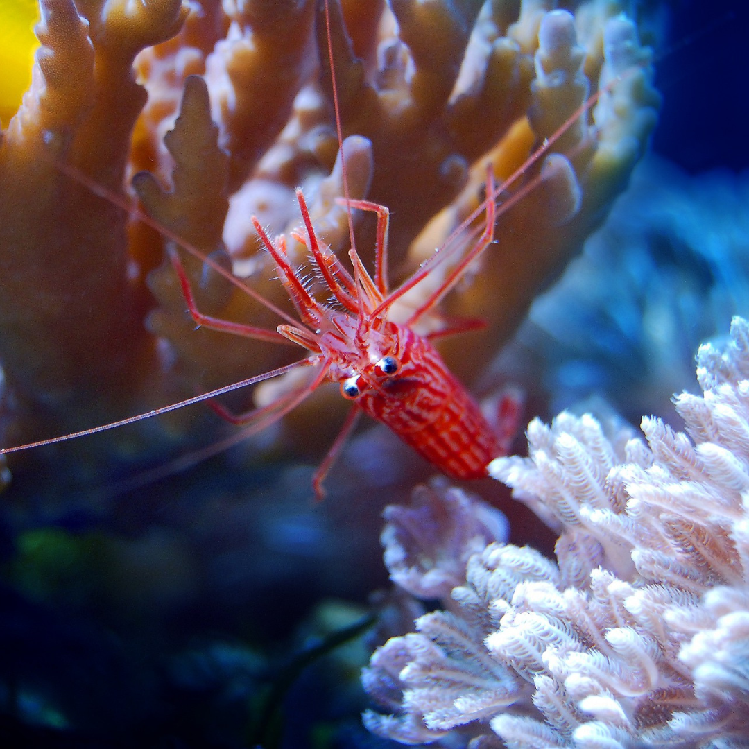 3️⃣ Harlequin Shrimp (Hymenocera spp.): These eye-catching shrimp feed on destructive starfish, such as the crown-of-thorns starfish, helping to prevent coral damage in your marine aquarium.